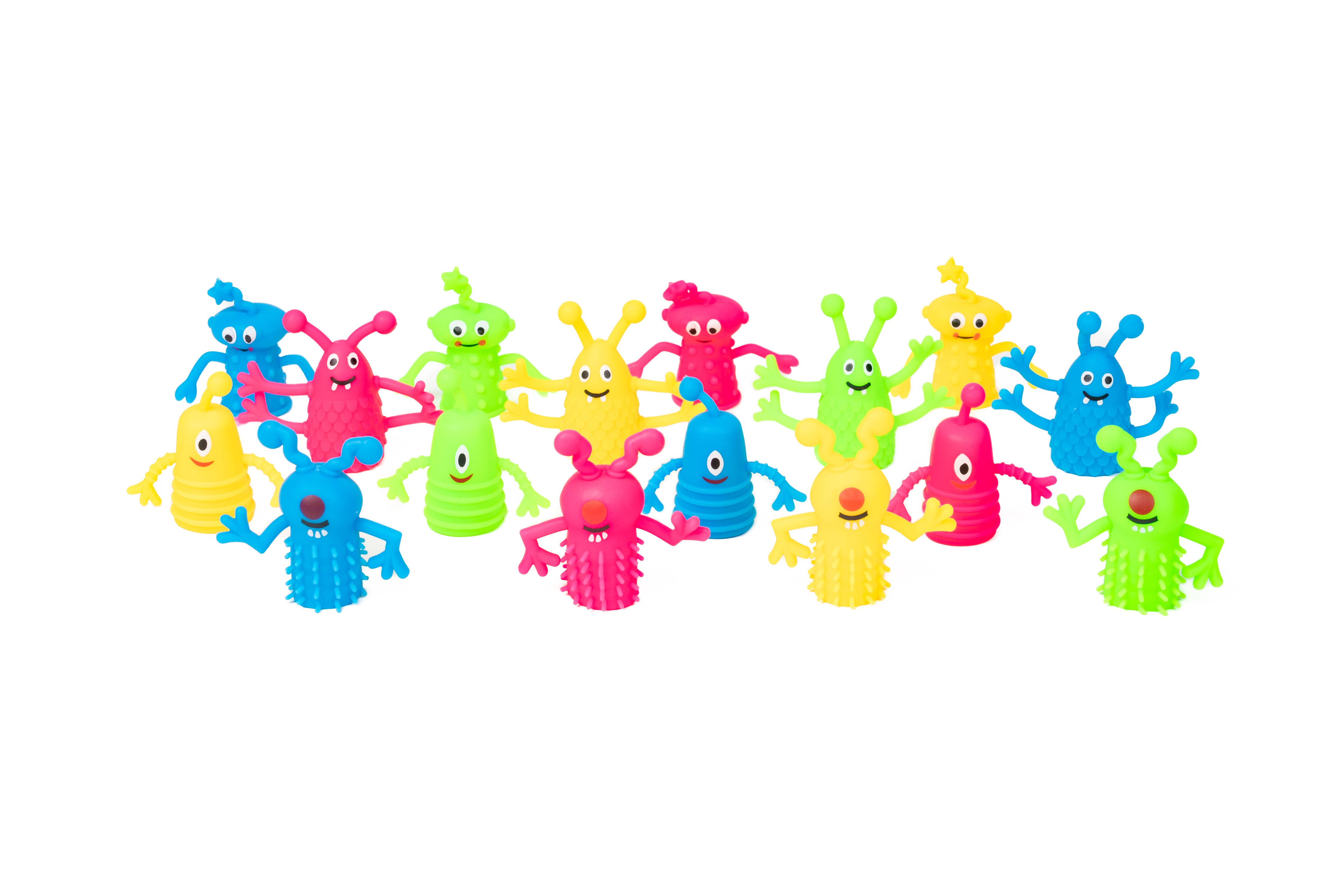 Monsters don’t have to be scary. Toysmith’s Monster Finger Puppets come in assorted styles taking on varying monster shapes and fit on a human fingertip. Available in pink, green, blue, and yellow. Each finger puppet is made of silicone and has a friendly monster face painted on it. Some puppets have multiple arms, others have multiple fingers. Put one on each fingertip and let the imagination run wild!